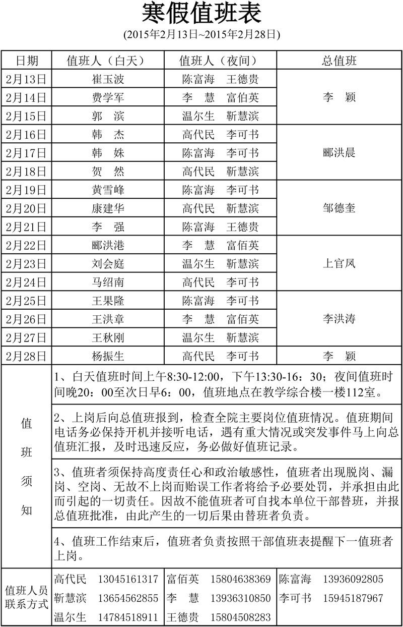 2015年寒假假期值班表(图)