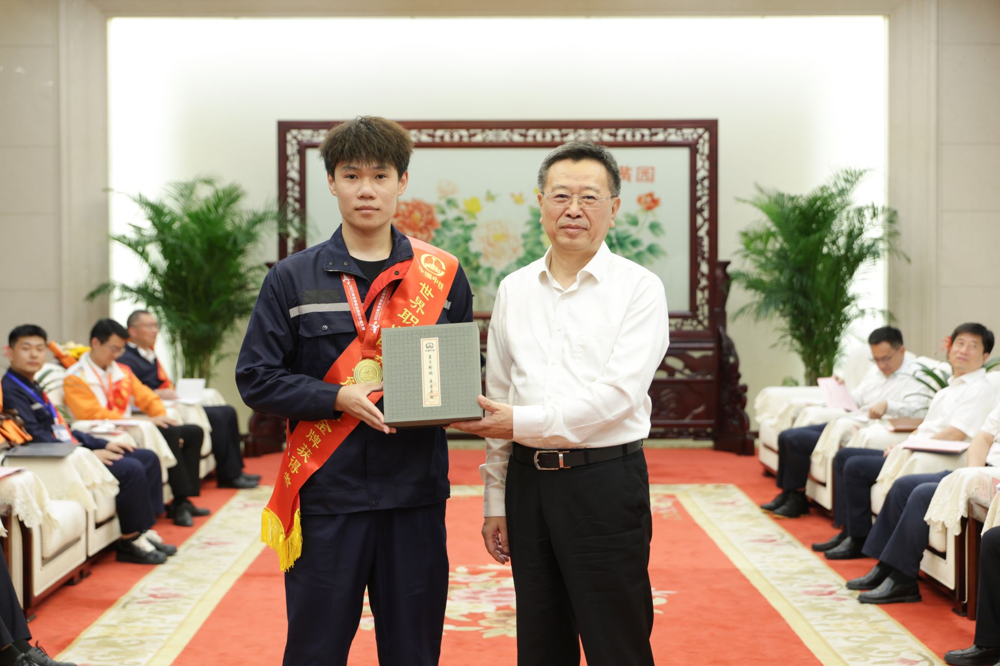9月29日,“中国中铁2025年大国工匠、赛事金牌获得者表彰座谈会”在北京召开。我院建筑工程学院冯浩龙、尤立霞老师及孙华谦、付桂鑫、程光磊、李梦媛4名学生,凭借在2025年世界职业院校技能大赛土木建筑施工赛道的卓越表现,斩获金奖并获企业最高规格表彰。中国中铁党委副书记、工会主席、执行董事。中国中铁办公室、党委干部部、党建工作部、工会、团委等部门负责人、中铁国资党委书记等领导出席,为获奖学生颁发纪念篆刻印章。
